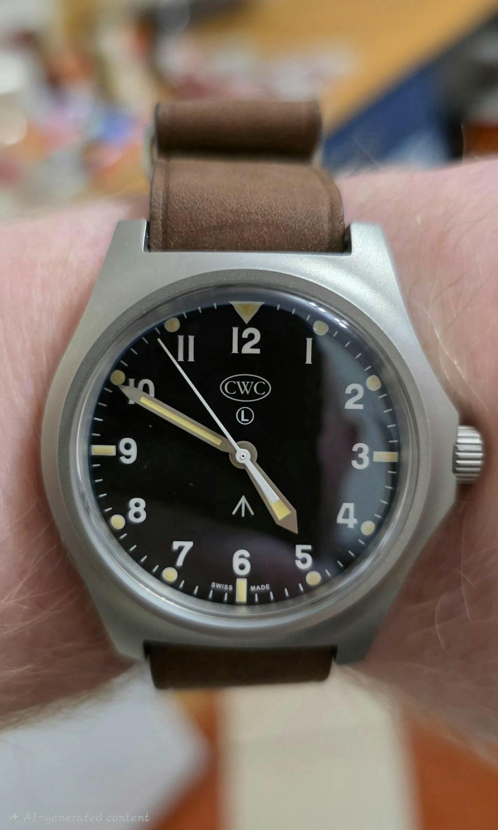 Swiss-made precision and quality in a rugged durable military stainless steel case with screw down crown and screw case back. Broad arrow on the dial and luminova luminous markings on the dial and hands. Dimensions give more wrist presence, extremely legible dial at a glance.